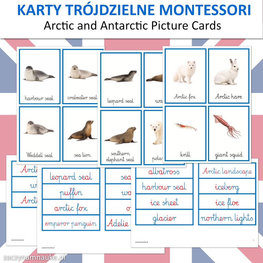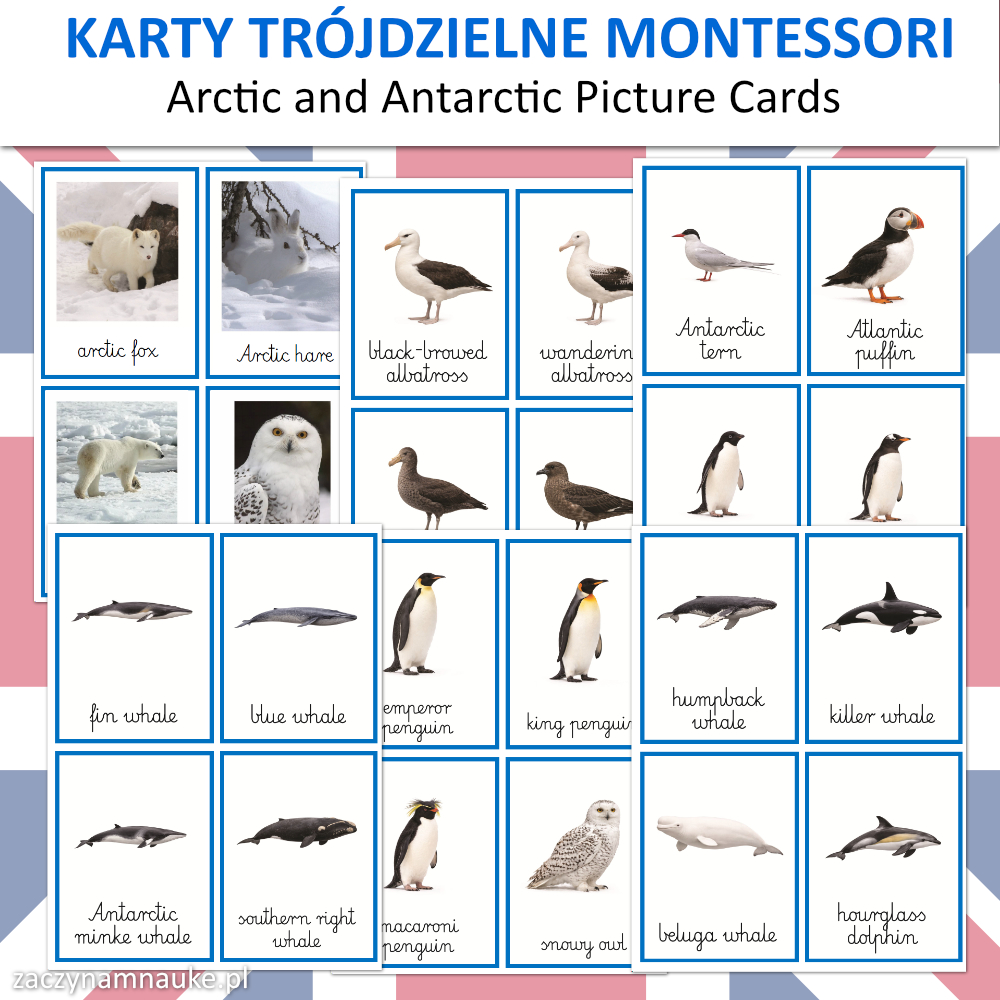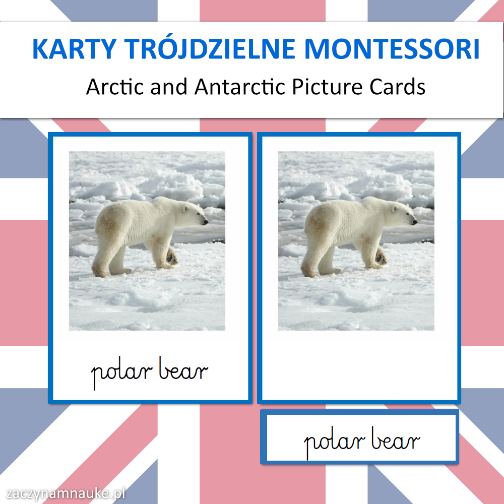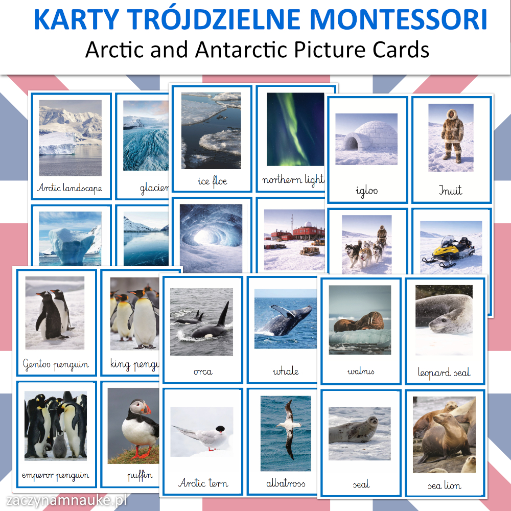 Karty Obrazkowe ANTARKTYDA i ARKTYKA (zwierzęta polarne) – 60 Trójdzielnych Kart Montessori