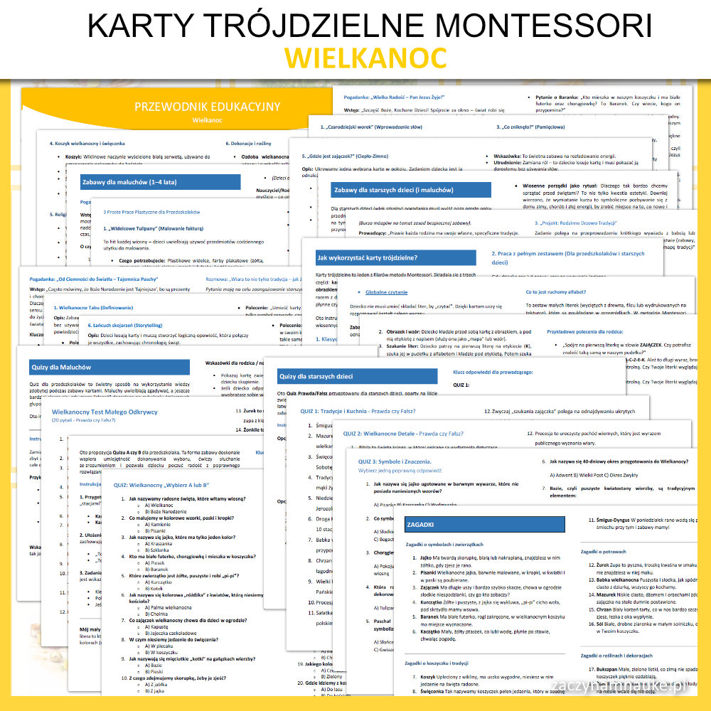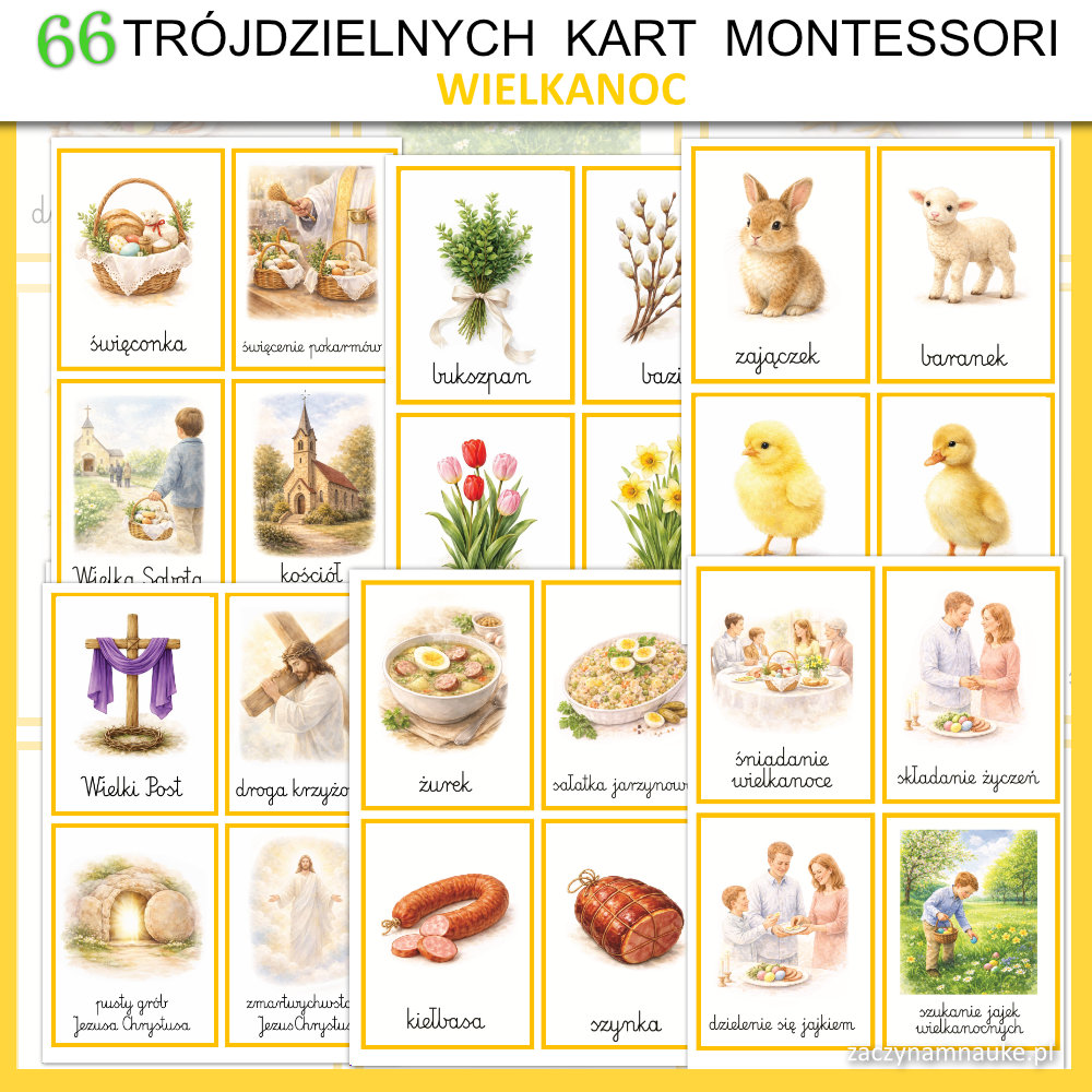 Karty Obrazkowe WIELKANOC do druku – 66 Trójdzielnych Kart Montessori Symbole i Tradycje Wielkanocy z Przewodnikiem Edukacyjnym