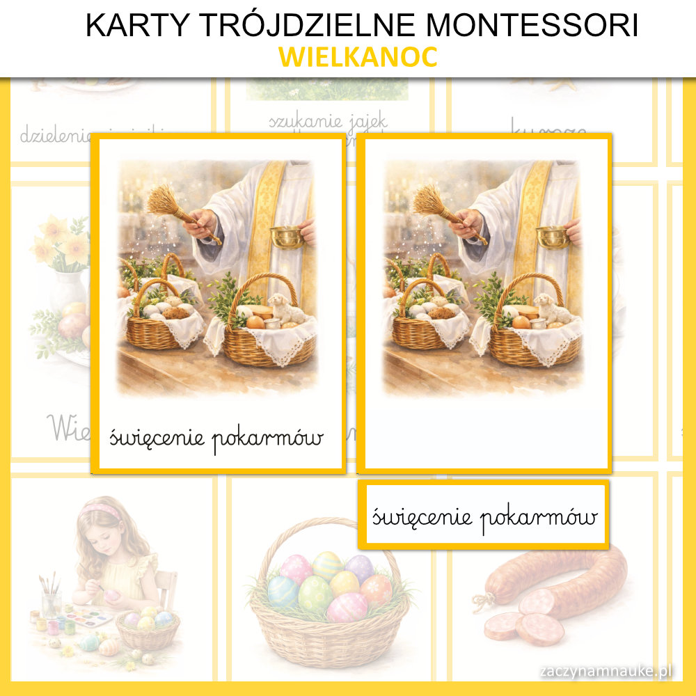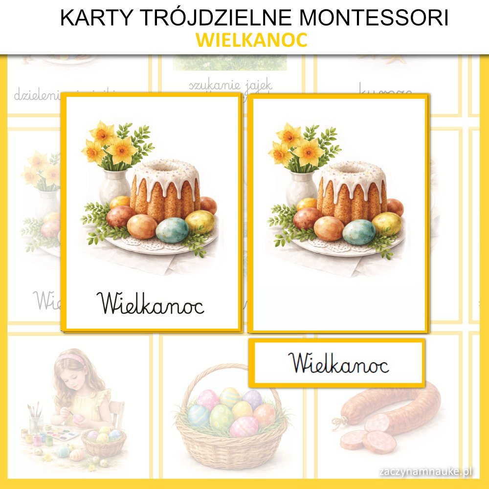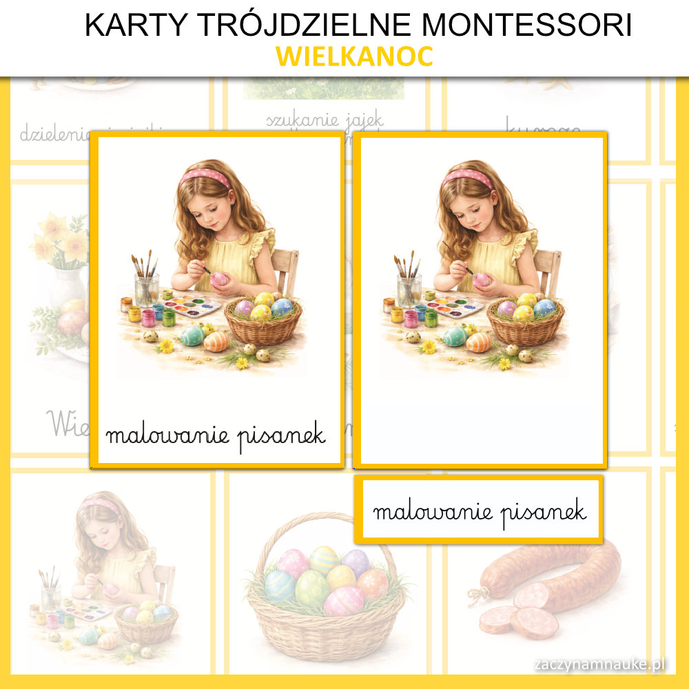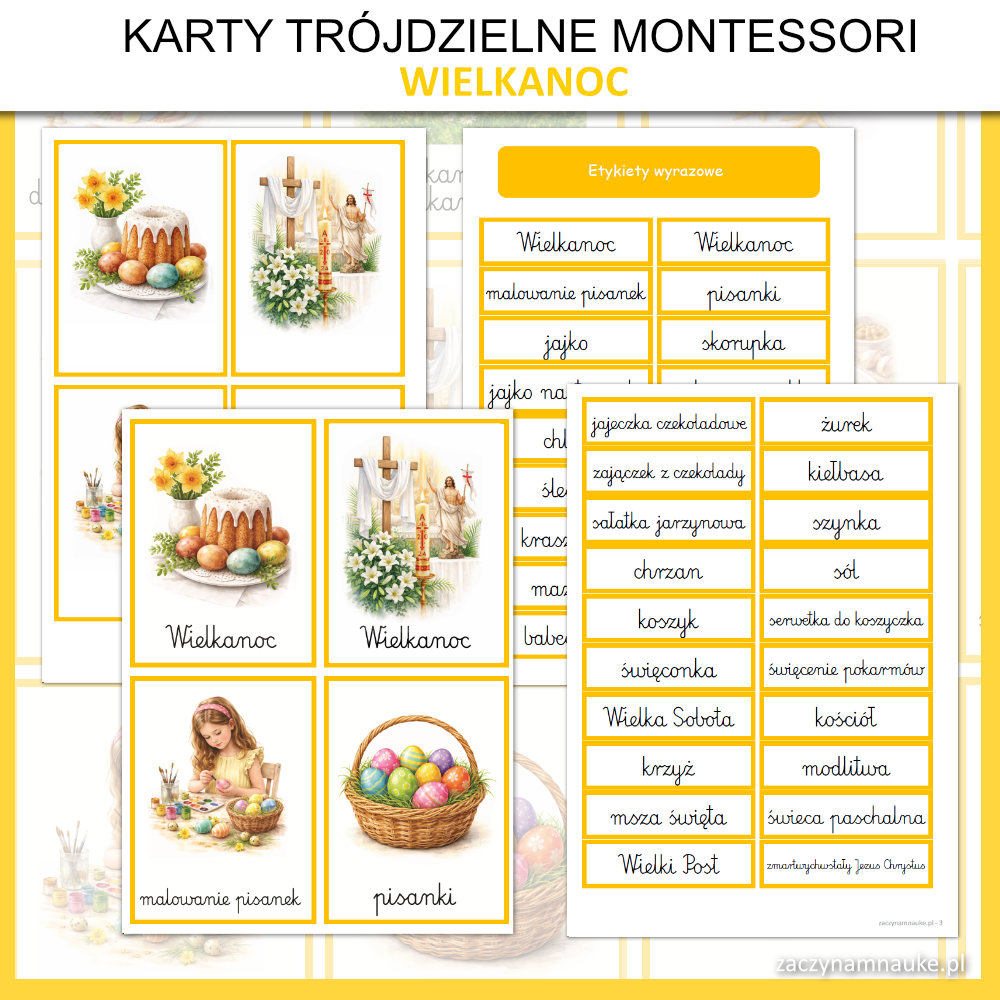 - Trójdzielne karty obrazkowe WIELKANOC Montessori, co oznacza że znajdziesz tu: