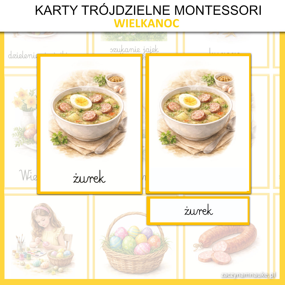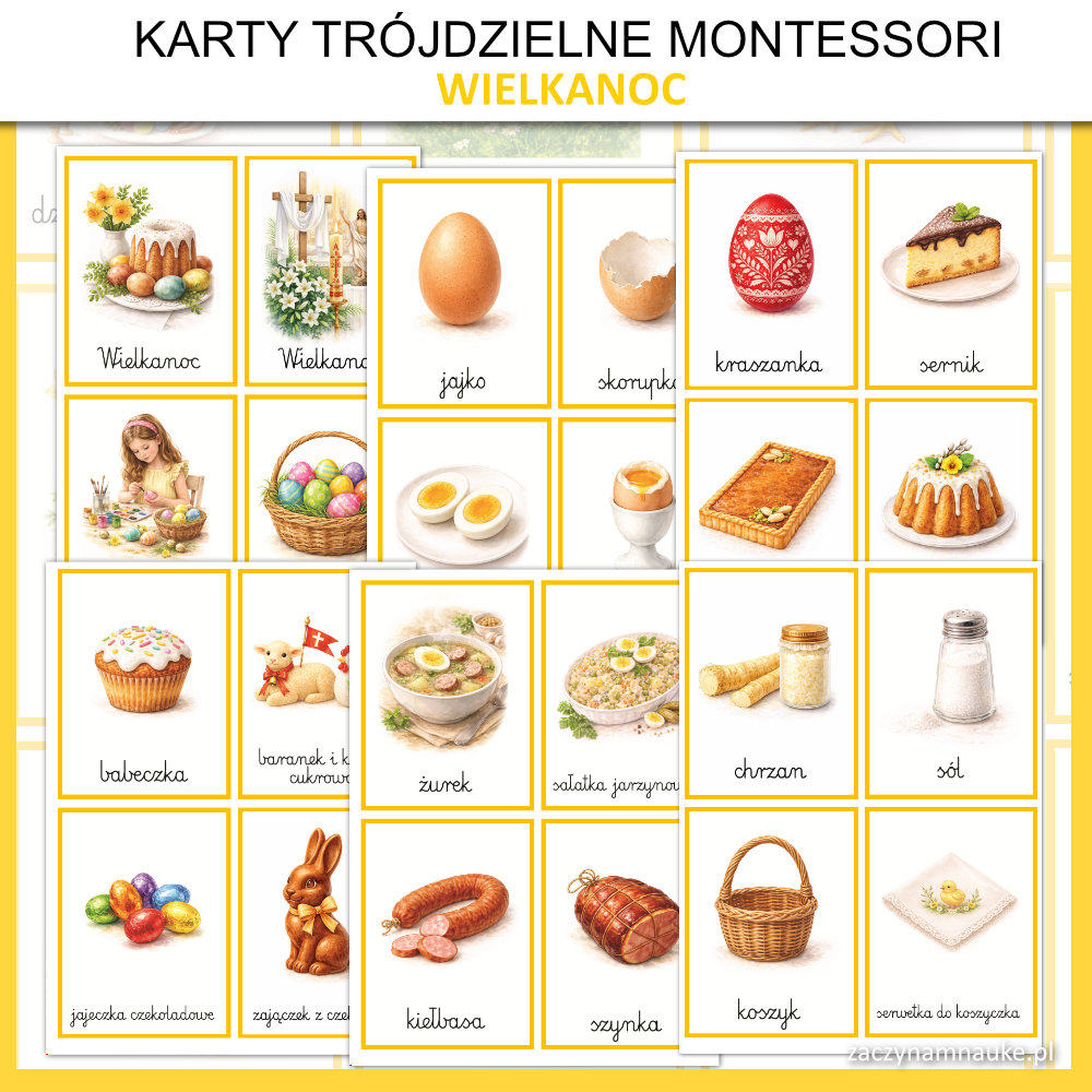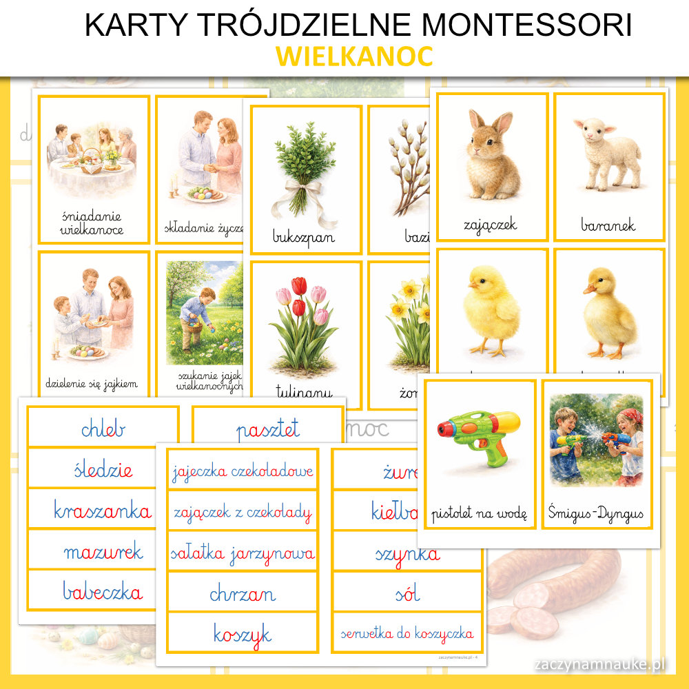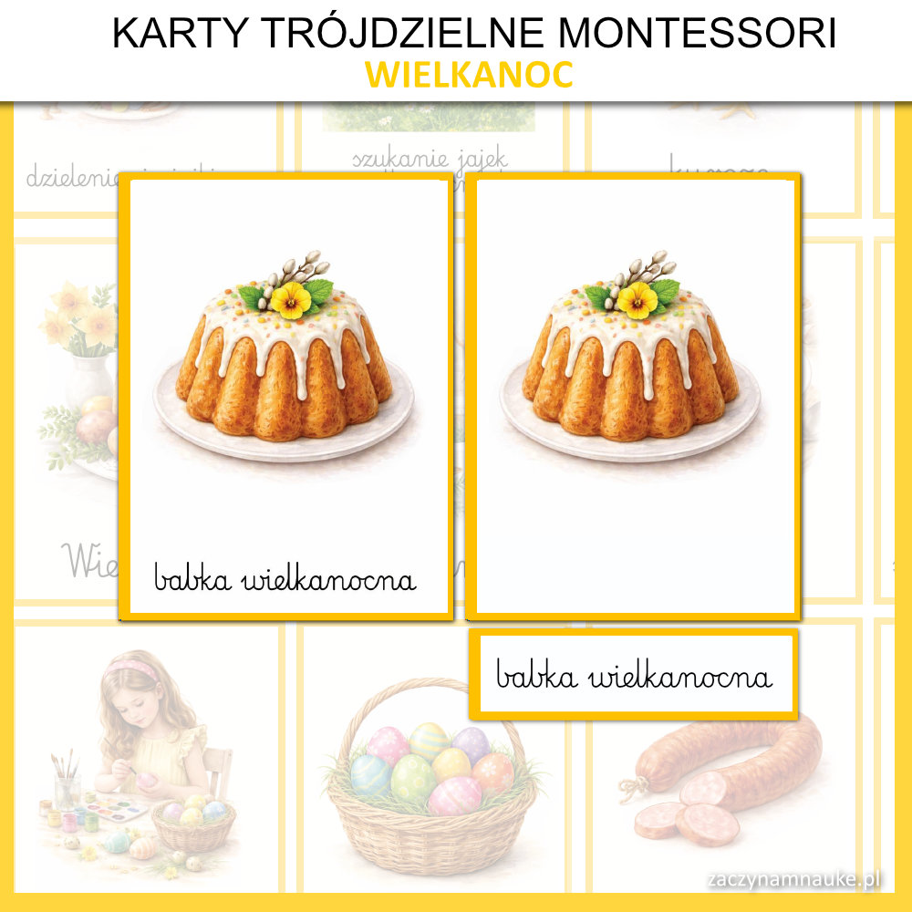 - Trójdzielne karty obrazkowe WIELKANOC Montessori, co oznacza że znajdziesz tu: