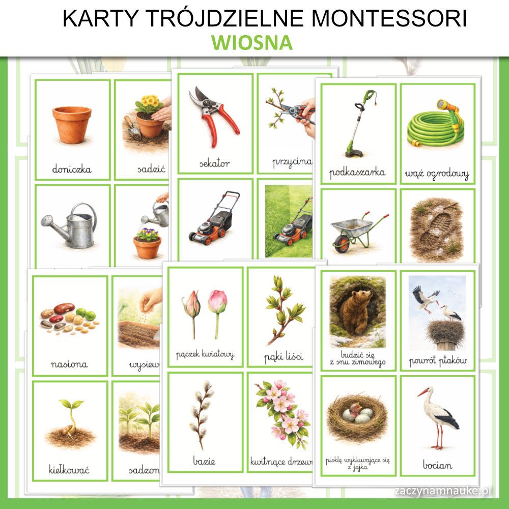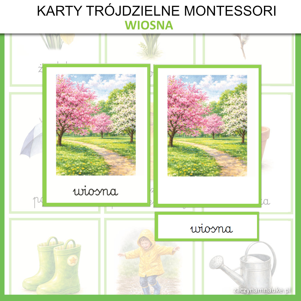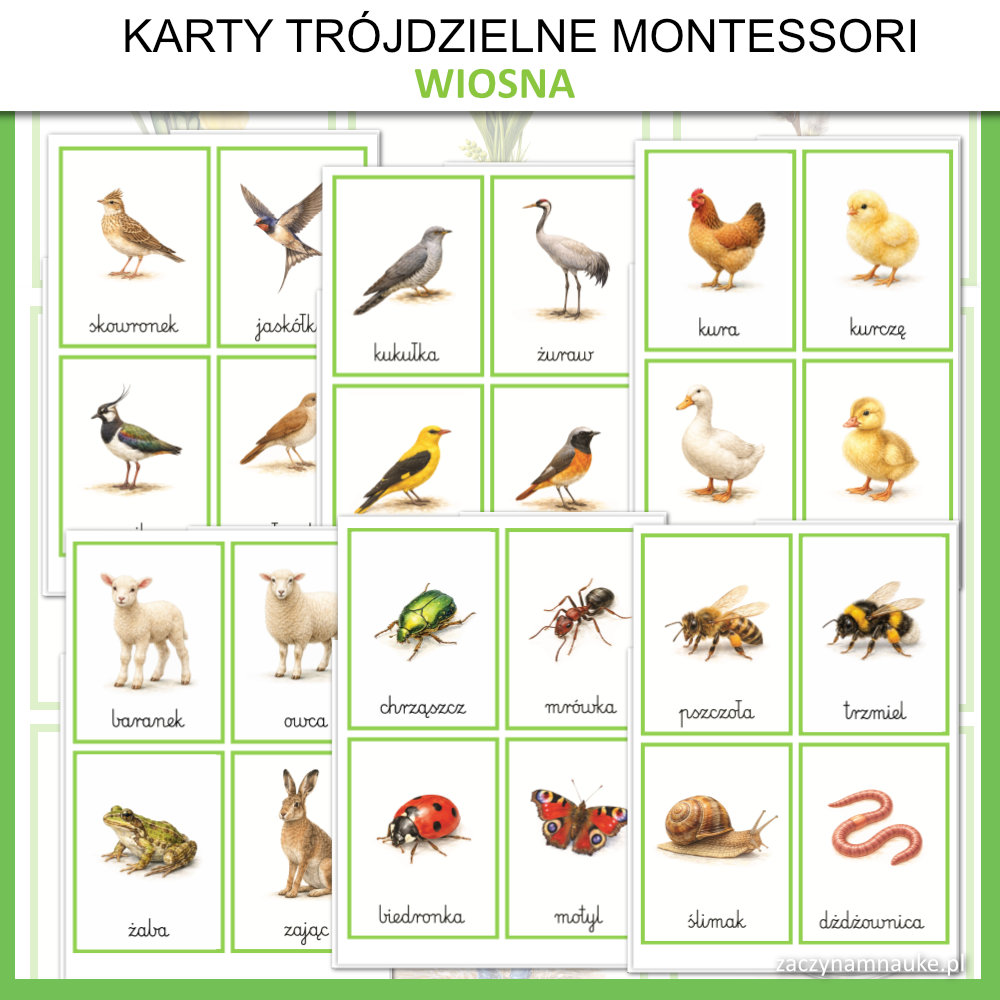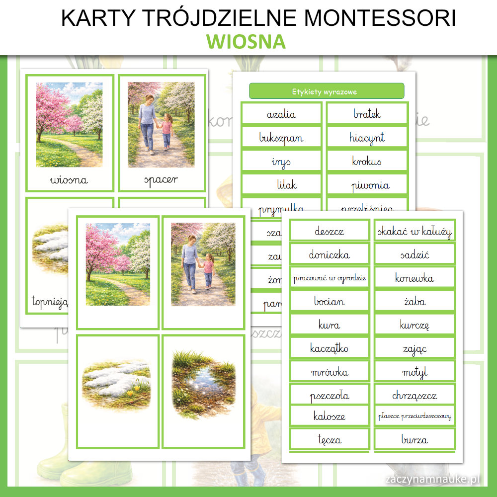 - Trójdzielne karty obrazkowe WIOSNA Montessori, co oznacza że znajdziesz tu: