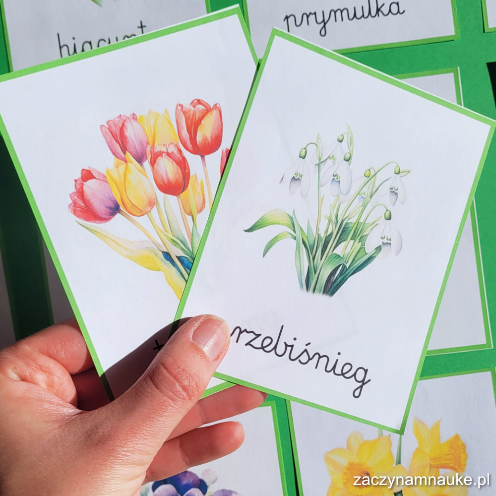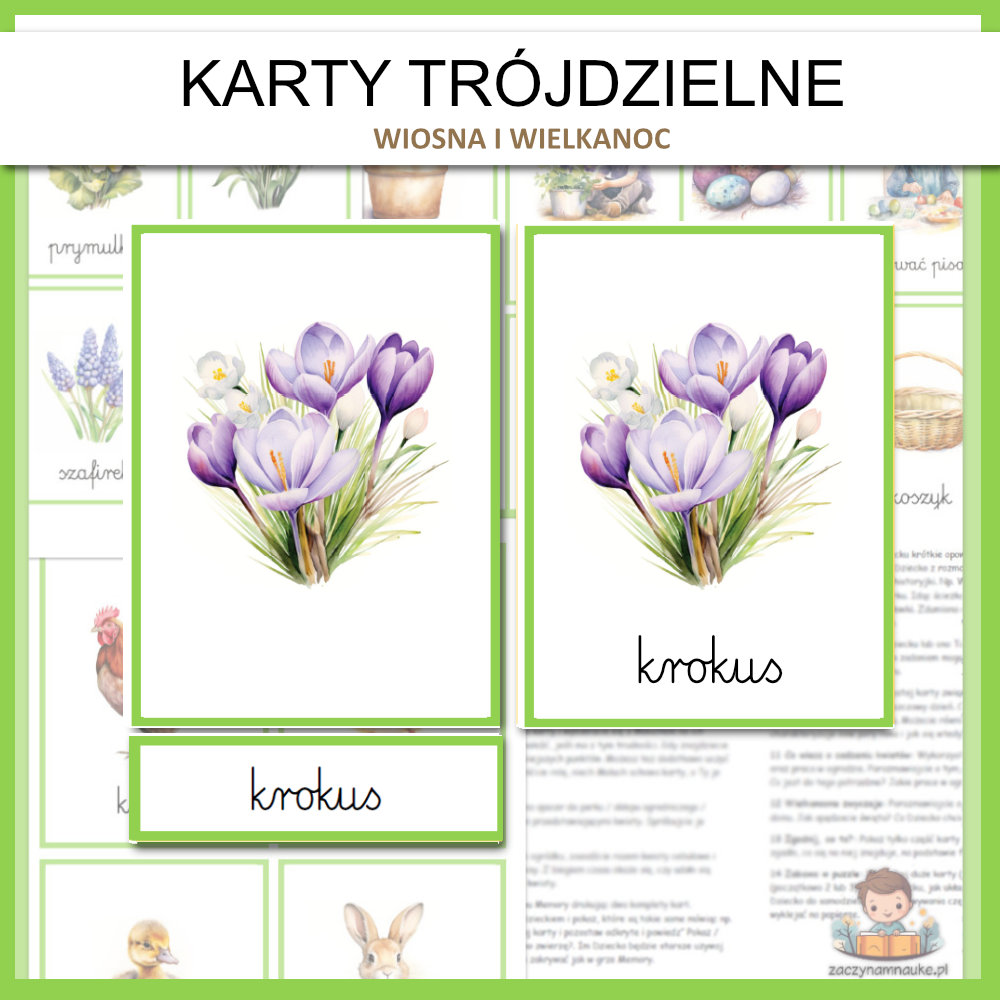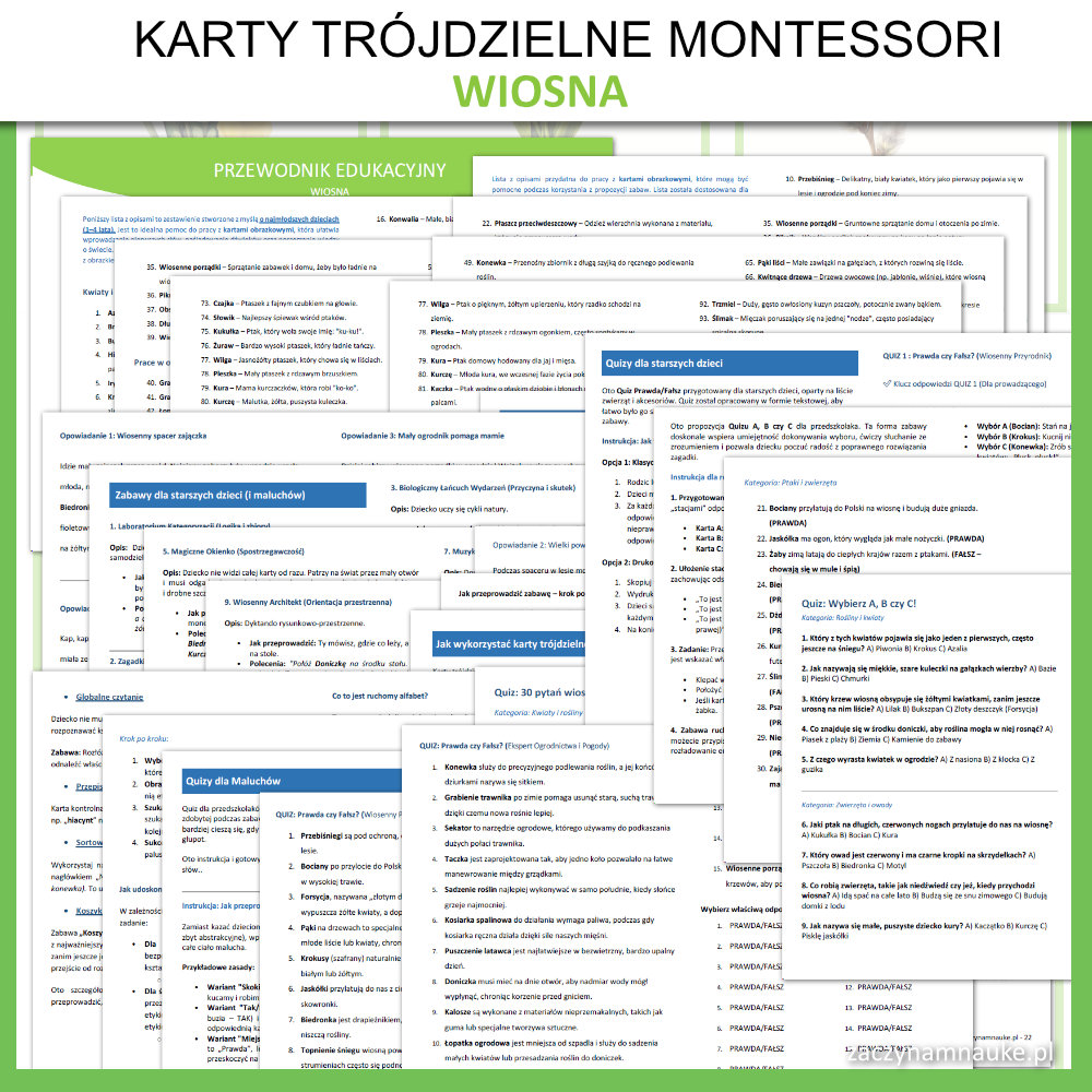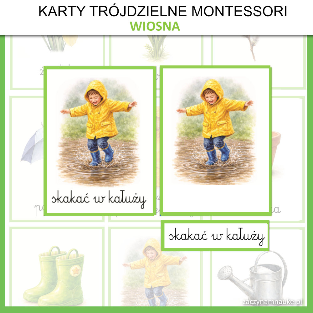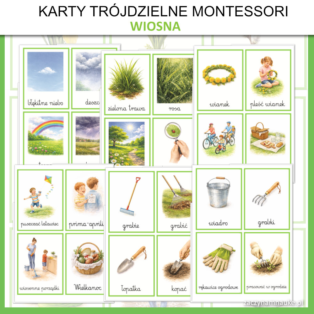 - Trójdzielne karty obrazkowe WIOSNA Montessori, co oznacza że znajdziesz tu: