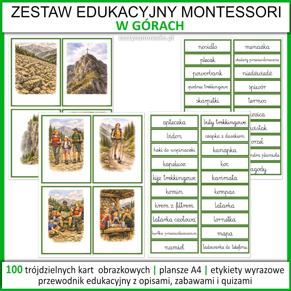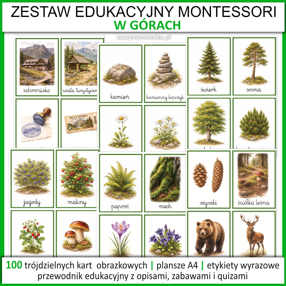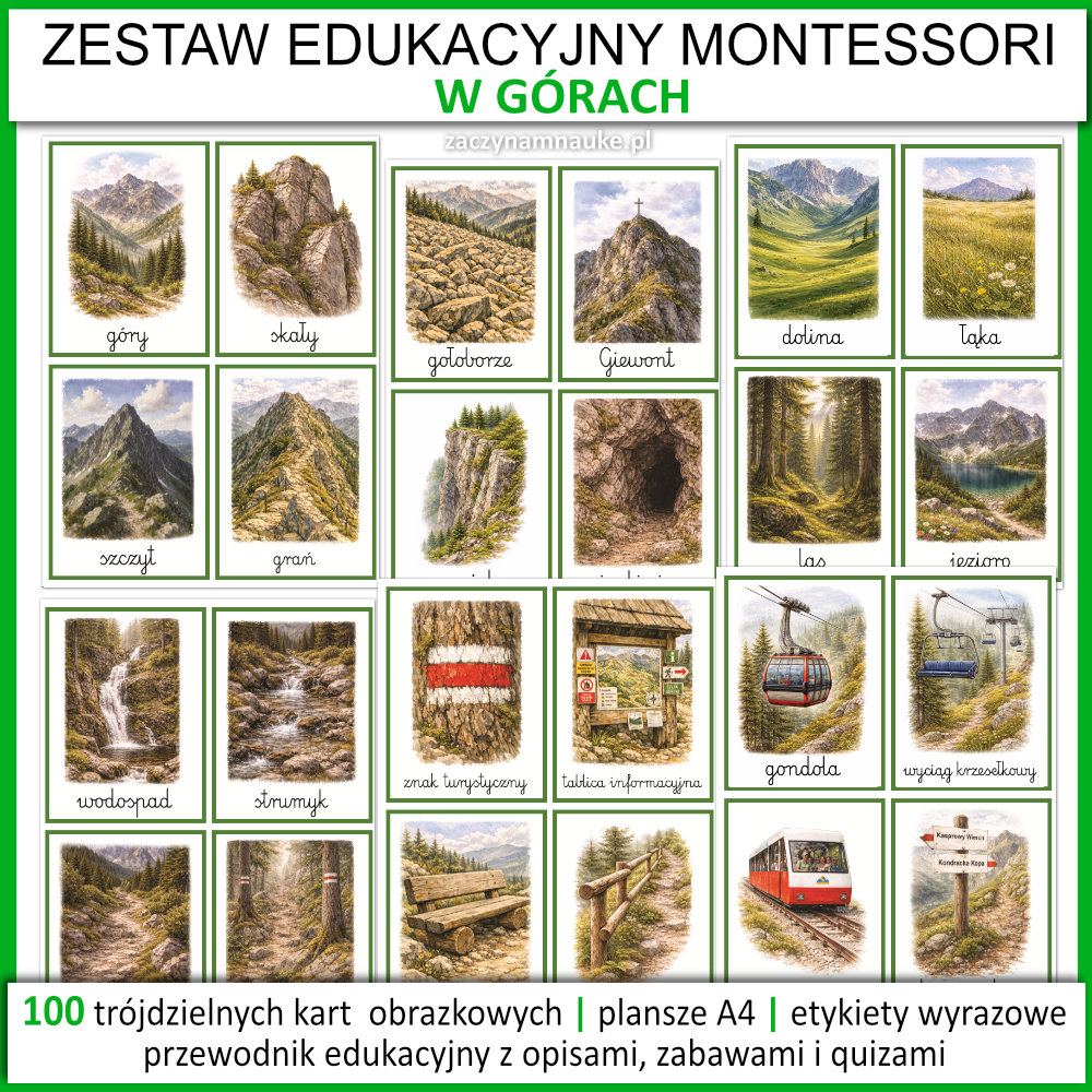 - Plansze Edukacyjne A4: Każda ze 100 kart dostępna jest w pełnym formacie A4 – idealne jako dekoracja sali na wakacje w górach lub gazetka tematyczna.