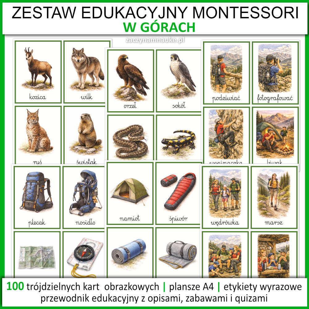 Ten zestaw to gotowiec dla każdego, kto realizuje temat w górach. Przedszkole i szkoła podstawowa mogą wykorzystać go do: