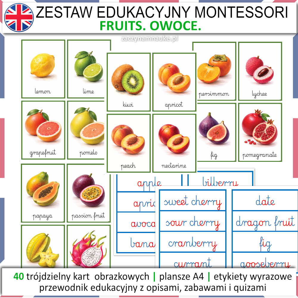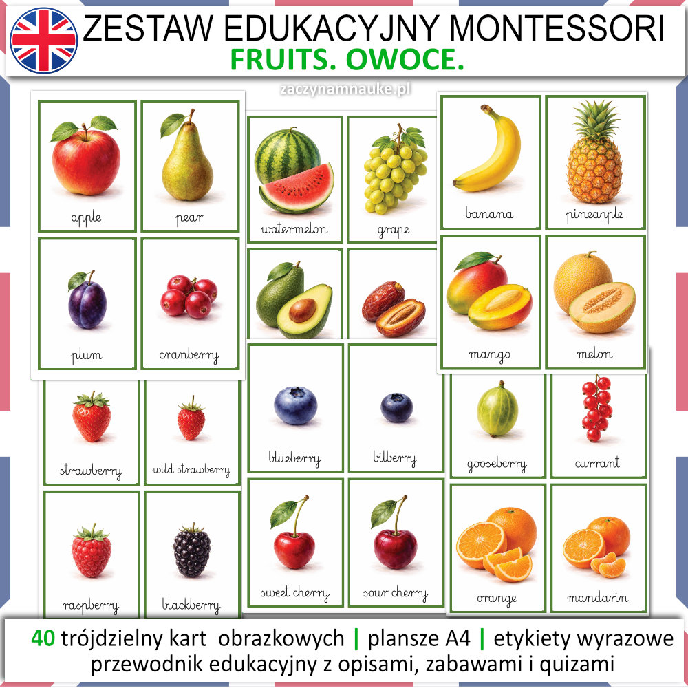 Owoce po angielsku dla dzieci – Zestaw Montessori 40 kart do druku | Fruit ESL Flashcards