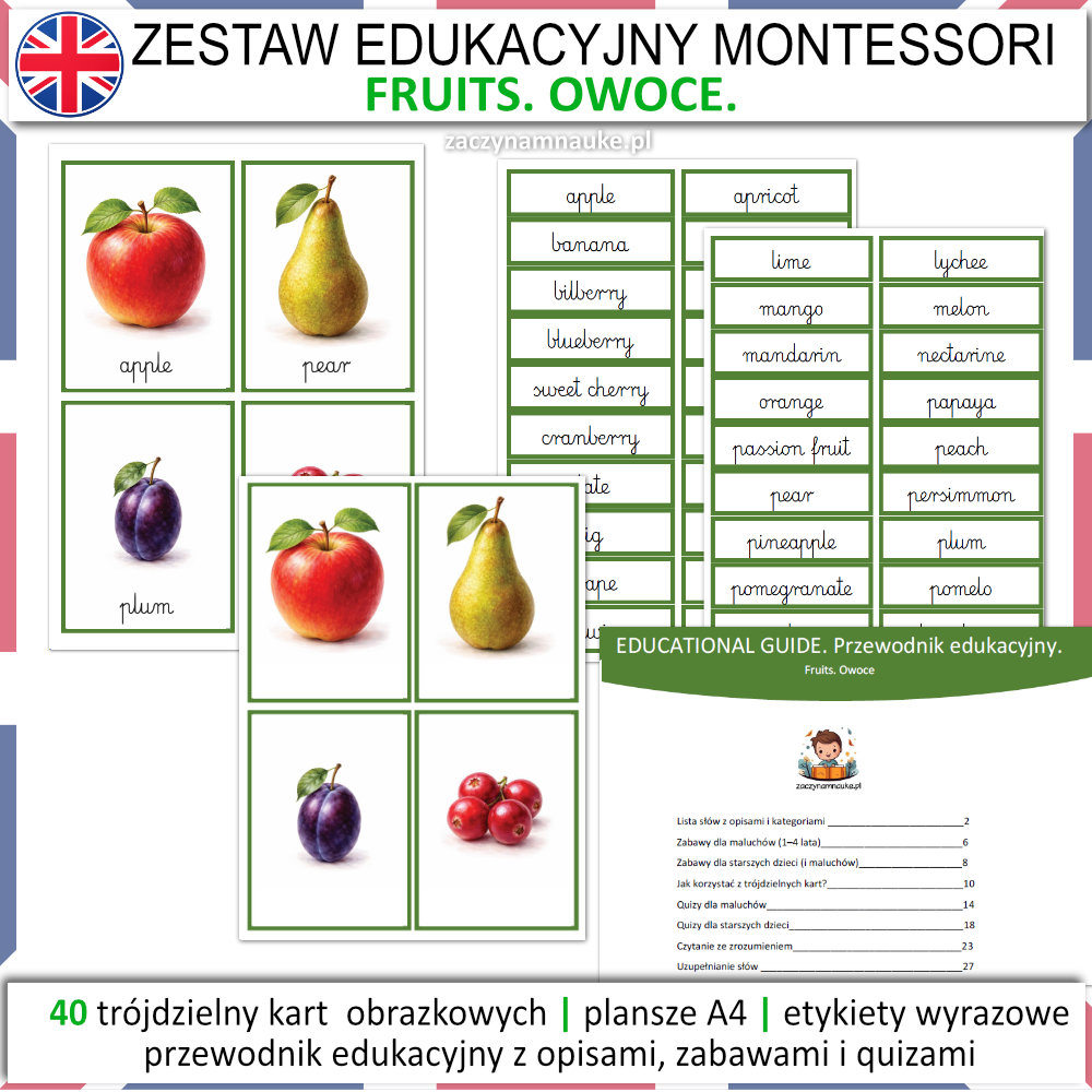 - Trójdzielne karty obrazkowe z owocami po angielsku Montessori, co oznacza że znajdziesz tu: