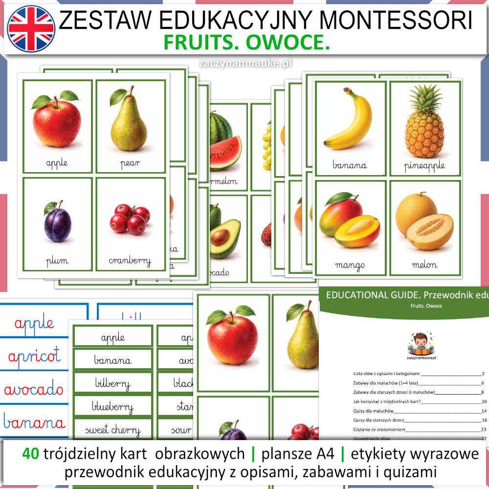 - Solidna podstawa w języku ojczystym: Pedagogika Montessori podkreśla znaczenie solidnego osadzenia w języku ojczystym. Polski zestaw pozwala dziecku najpierw poznać właściwości owoców, ich biologię i ciekawostki, co stanowi fundament do późniejszej, swobodnej nauki angielskich nazw.