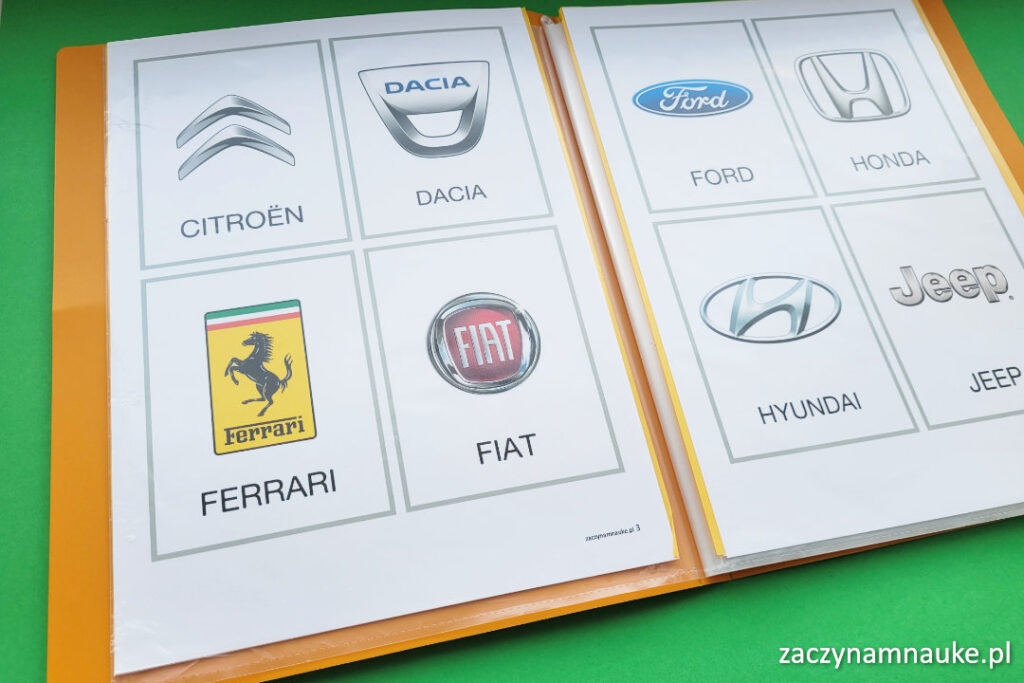 Na bieżąco zgodnie z zainteresowaniem Dziecka tworzę do auta albumy z naszymi kartami obrazkowymi. Drukuję plansze na grubszym papierze i umieszczam je w katalogu ofertowym. Syn może sam korzystać z albumu lub razem go przeglądamy i czytamy.